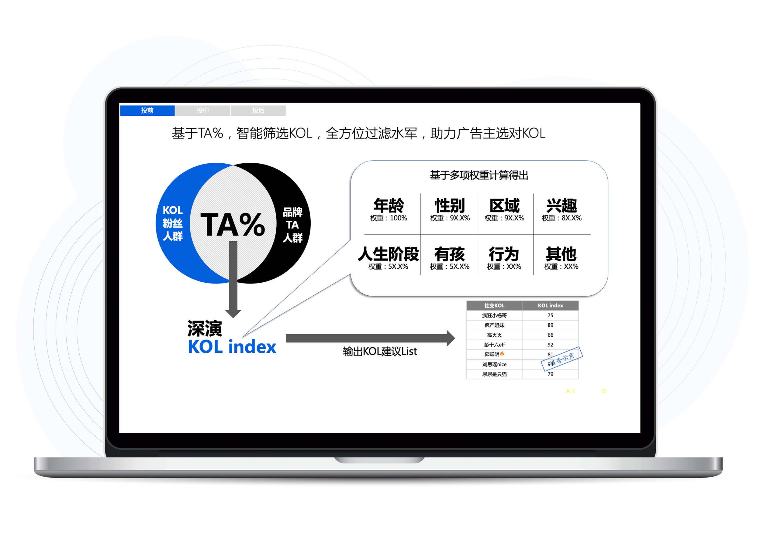 深演K参谋科学前选可以跨领域找到最能影响品牌目标人群的KOL进行投放,同时有效平衡投资回报率
